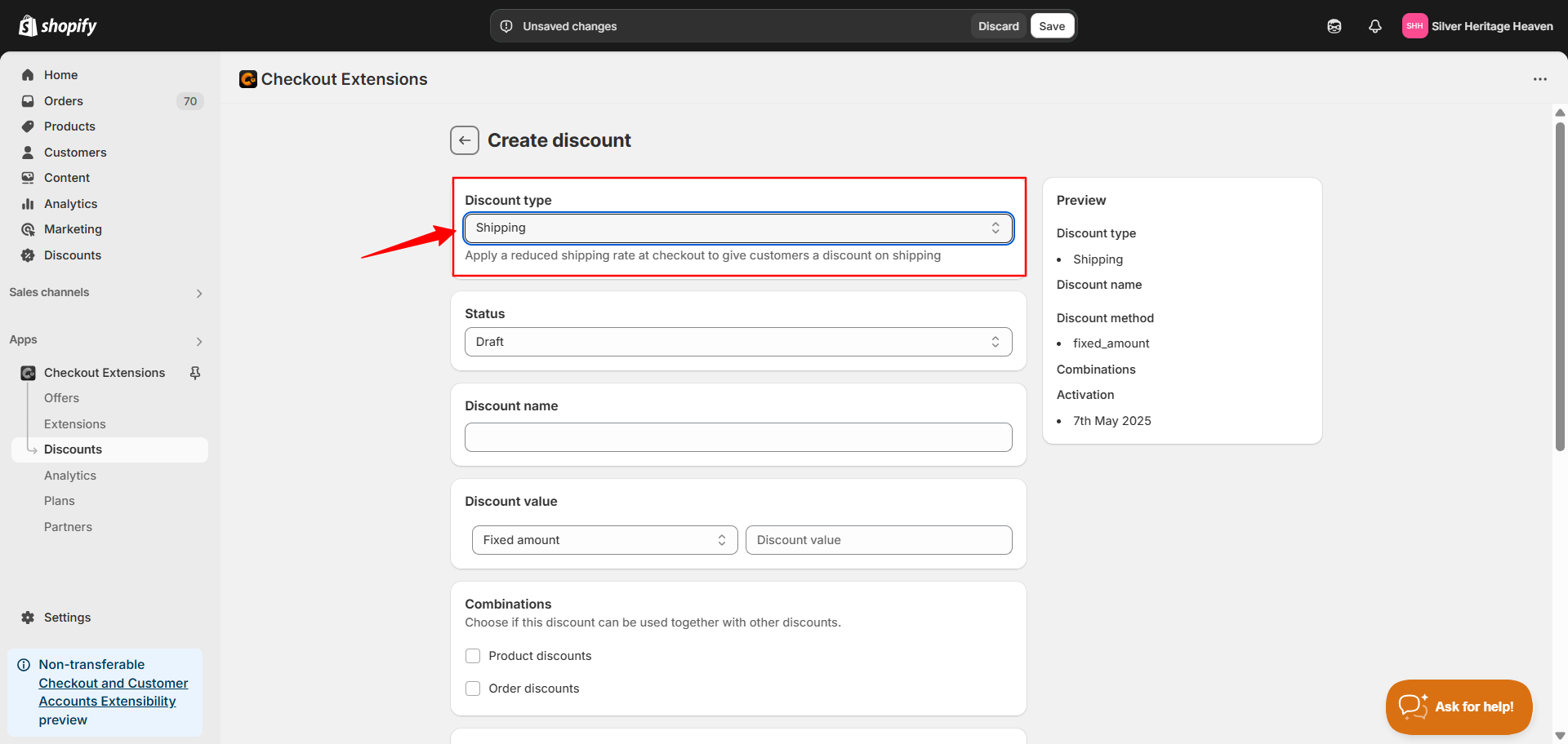 - Select the "Shipping" from discount type, add the products you want to include, and enter the discount amount or percentage in the 'Discount value' field.